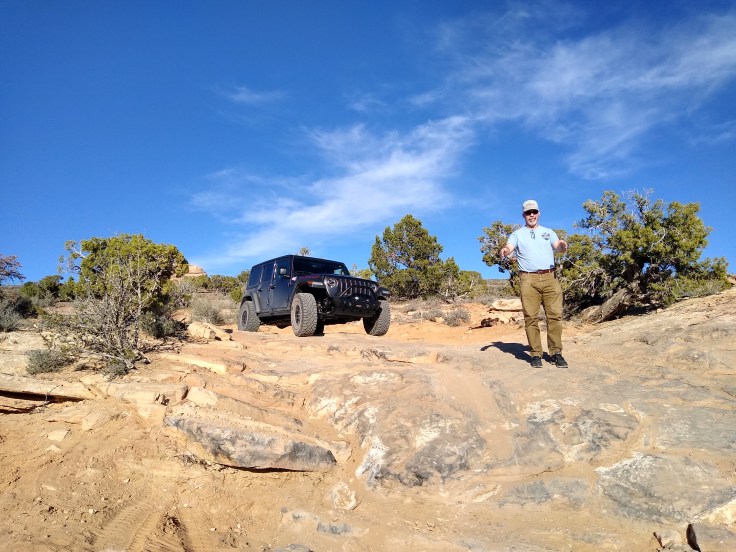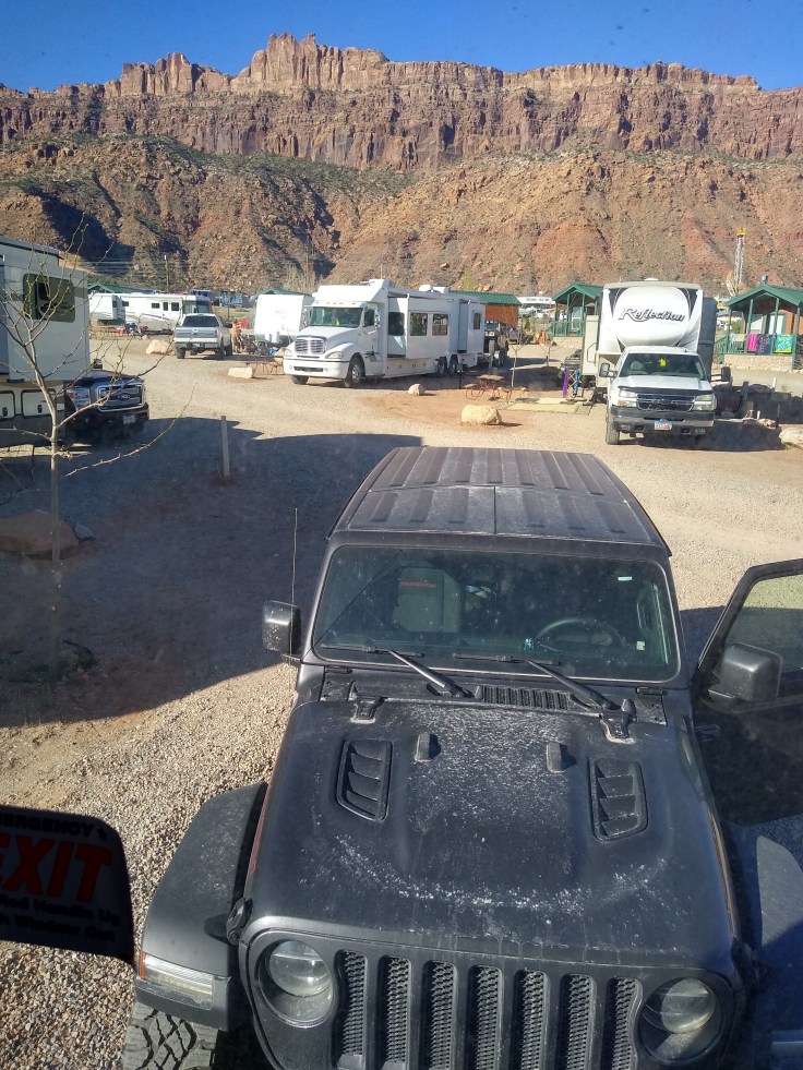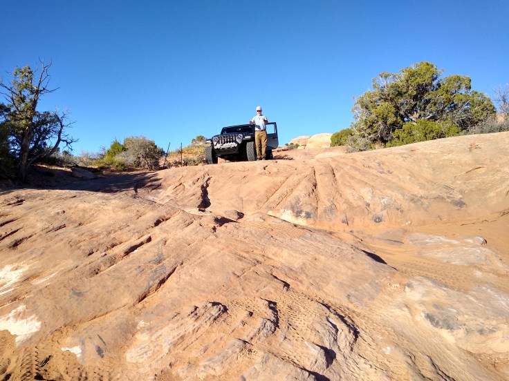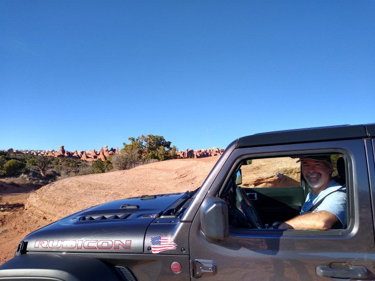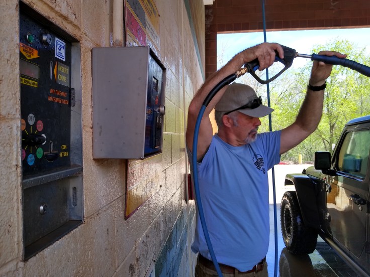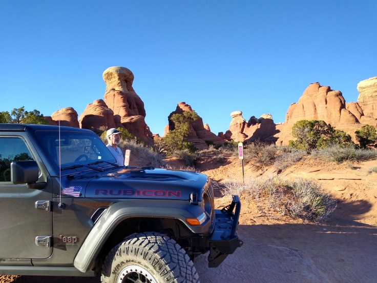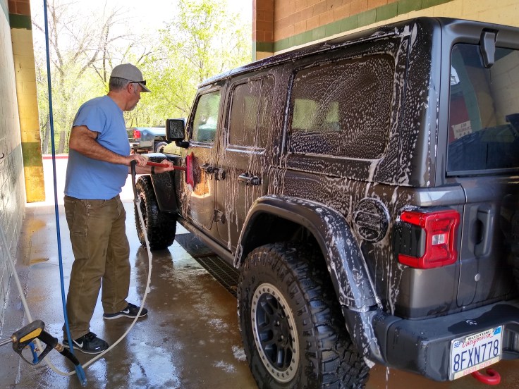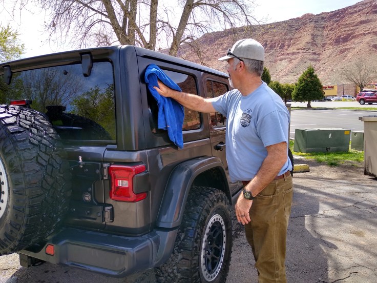Then after our usual breakfast routine Fred decided he needed to wash the Jeep before we went 4wheeling. In all honesty, she was filthy, but we were going to get her filthy anyhow… So we cruised around Moab and found a self-service car wash. And for the next 30 minutes Fred soaped and polished his Jeep. He enjoys detailing cars like you wouldn’t believe! But we had other goals for the day beside rubbing on the Jeep.