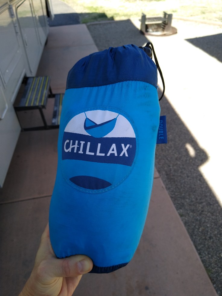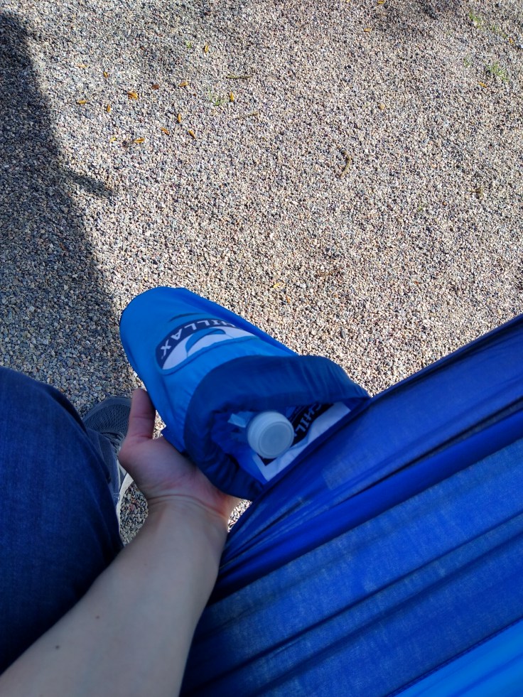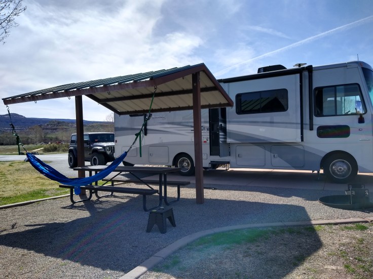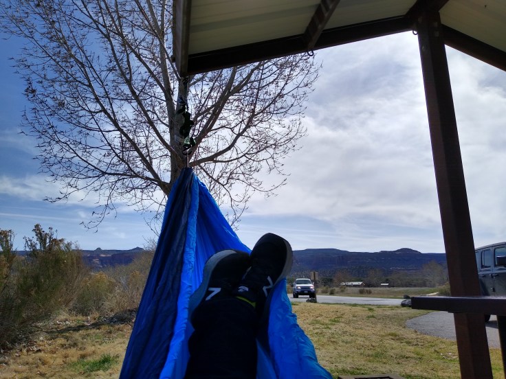 And today is that day… The park we just arrived in, the James M Robb Colorado State Park in Fruita, Colorado, bans them in trees, however, they provide these nifty shade structures with hooks along the edges. It’s genius! I’m so happy right now! I get to use my hammock… And, bonus, I just figured out the sac the hammock comes in doubles as a drink holder.