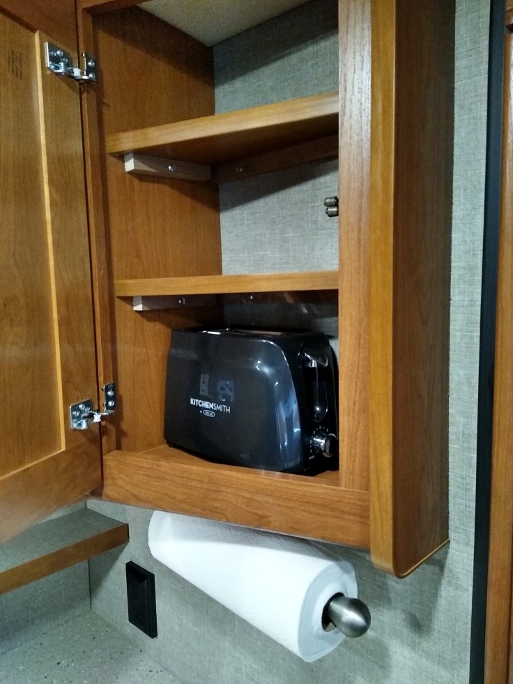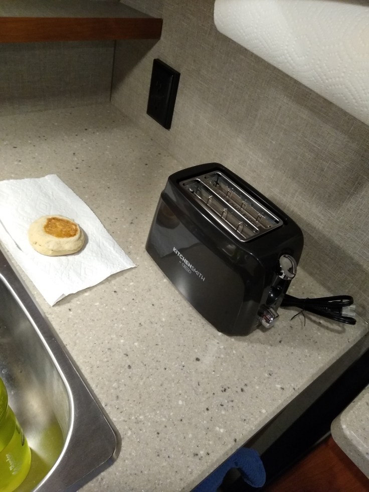 We found this mini toaster that fits perfectly in the RV’s tiny kitchen cabinet. You have to toast your English muffins twice, but it’s funny enough to use a mini toaster that I don’t mind. It adds a little chuckle to breakfast time.