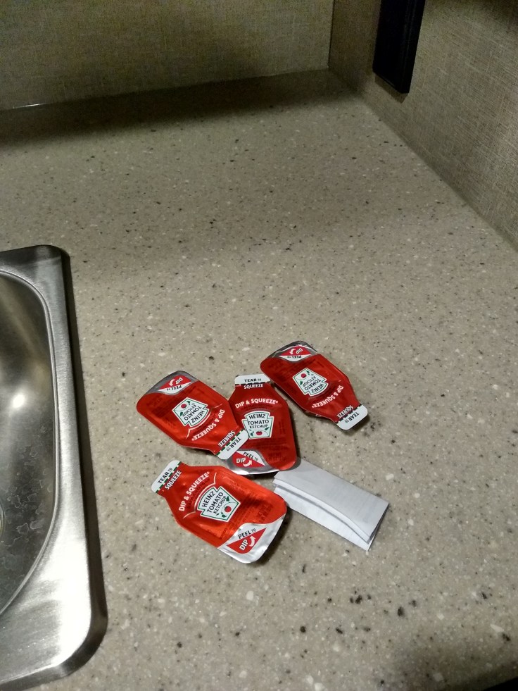 And bonus, Fred had left over ketchup in his pocket when we got back. Which is great because we don’t have any in the RV 🙂