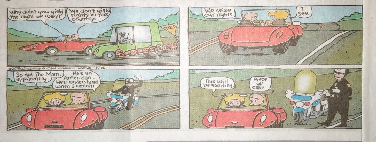 Sunday, May 12: Today Vanessa planned a 10am Mother’s Day brunch with Long Island style lox and bagels (onions, tomato, cream cheese, & lox on a bagel) with Mamosas, and homemade coffee cake.It was pretty coincidental that Mike and Fred were reading the comics in the Wallstreet Journal. The conversation we were having the night before about police powers was summarized with one simple cartoon.