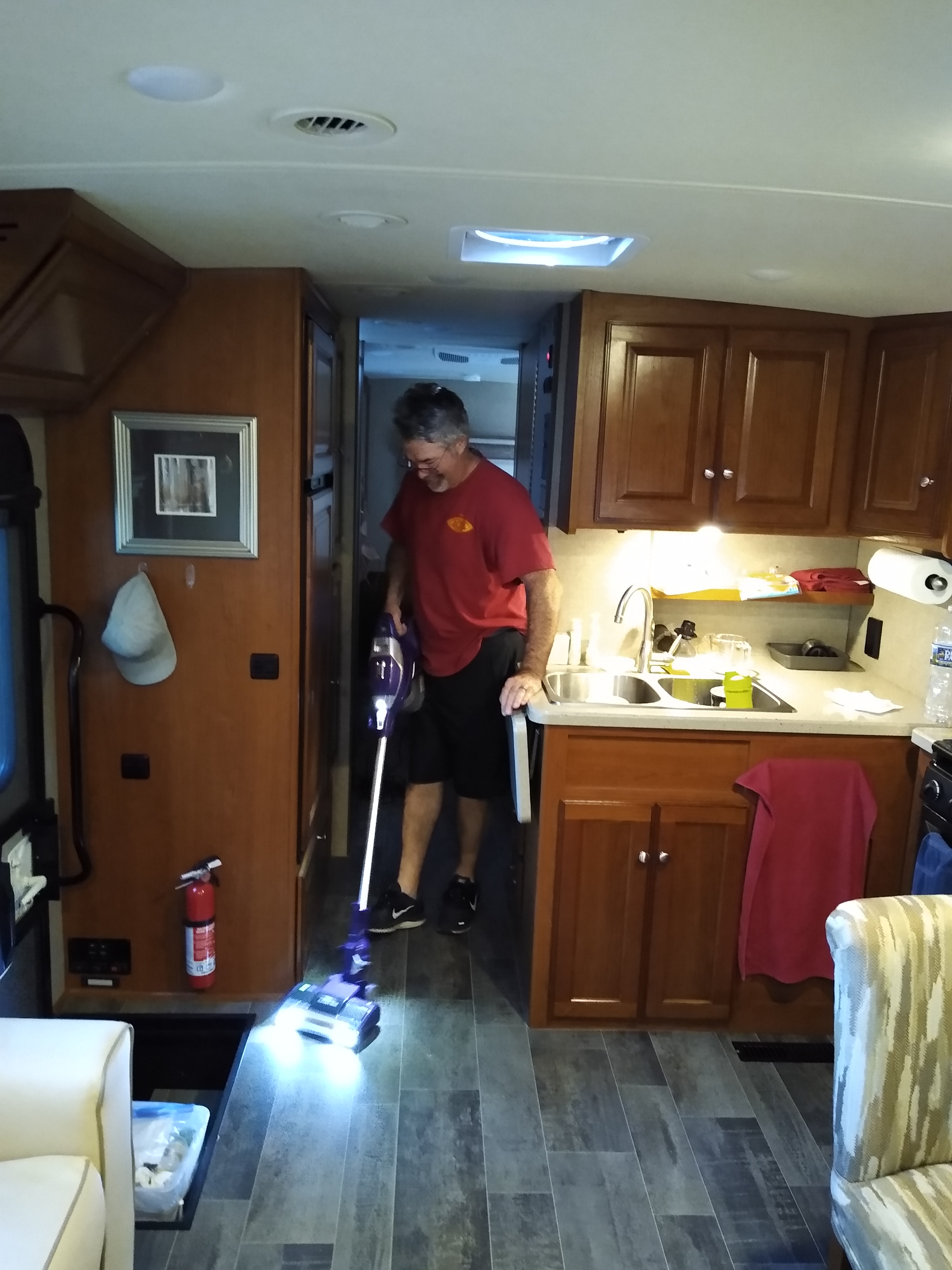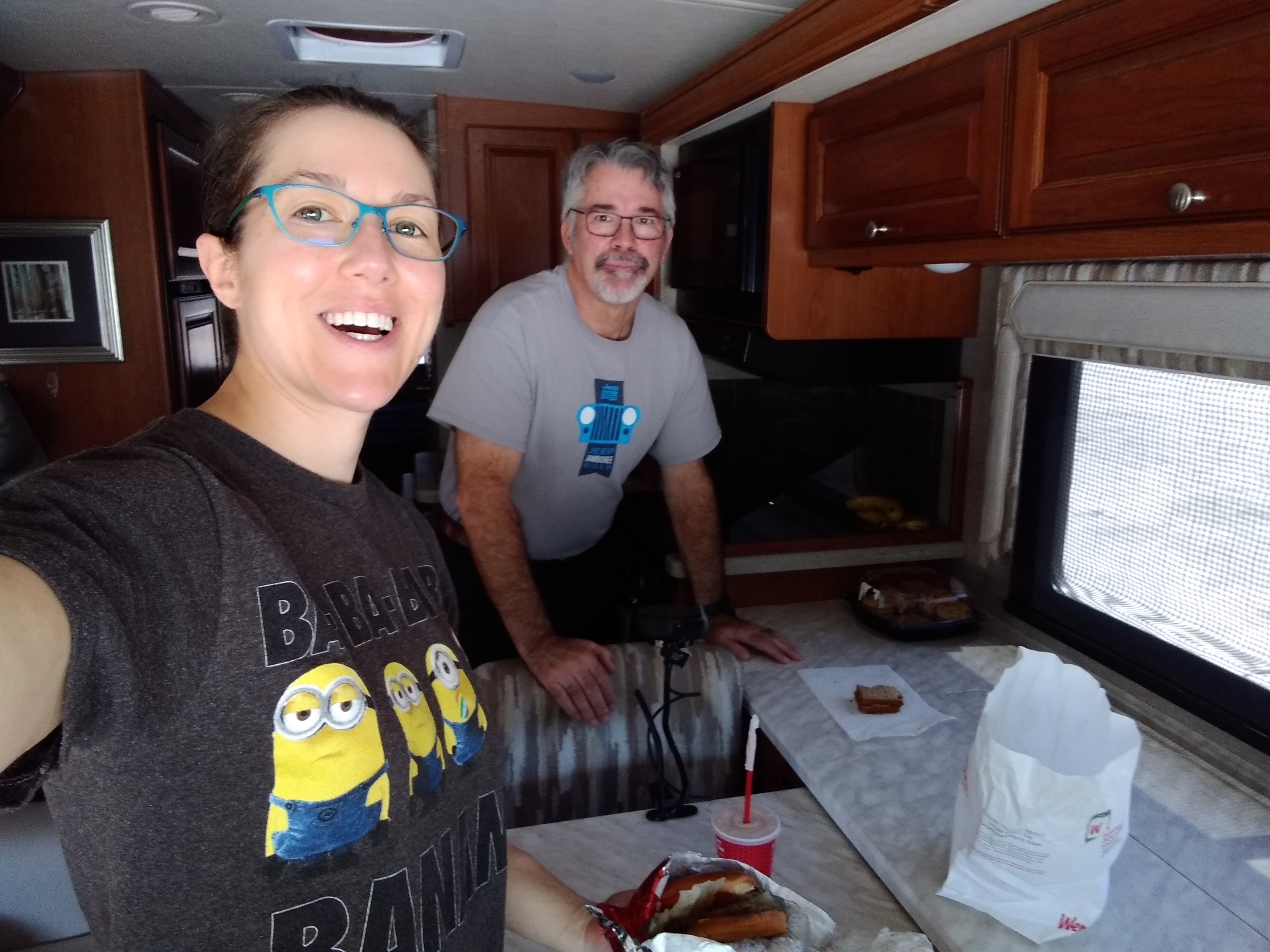 After our usual oatmeal breakfast, Fred talked to his buddy Michael Valentine on the phone. Michael has been a great friend to Fred since they met each other in the Air Force back in the 1975. They were roommates in the barracks.The best way I can describe Michael is as an energetic force of fun and light. He is absolutely willing to do anything for a friend. He has been keeping great tabs on us on this journey. We are trying to coordinate a visit with him down in Jacksonville, Florida this weekend.Since we had so much extra time this morning, we both took showers in the RV. We have gotten that down to a pretty good science now. Plus its so hot and humid in the south already that the icy trickling water that comes out of the shower head in water-saver-mode actually feels good. When you don’t have to dance around in that tiny shower to avoid a cold stream of water, a shower is so much more enjoyable.Fred showered 1st and then went outside to hook up the tow bar to the Jeep. I enjoyed my showered and then needed to grab the shammy towel we use to dry the shower. It was in the kitchen because I used it to dry the living room after I left all the windows open in Virginia.So I opened the divider door between the bathroom and the living room. To my surprise, all the windows were open and Fred and our camp neighbor were standing just outside the rig chatting about manly things. So some lucky guy from Pennsylvania got an eye full of my nakedness today.Things like that don’t bother Fred. He is a bit of an exhibitionist. I, on the other hand, am a super-prude. I don’t even like wearing shorts because I feel like it shows too much skin. So that will bother me for a long time.On the plus side of my shower today… I figured out what I want to do with my life after CHP. I have been struggling with losing my career. CHP was so perfect for me and allowed me to help people and feel like I was really making a difference everyday. I have been racking my brain to find a replacement that not only satisfies my love of being outside and being physical, but also allows me to really change peoples’ lives. So in the shower, it hit me. I can combine all of those things and get a job in some kind of physical therapy capacity. I figure you can do that anywhere and make your own schedule. That thought made me pretty happy and shed a little light on the future. 💡😀💡We packed up, hit the road, and drove for about 30 minutes. Then we stopped for gas. As it always is when we hit the road, it was lunch time. So Fred gassed up the RV for ($2.40/gallon!) and made himself a PB&J sandwich. I enjoyed exploring the gas station store, and then grabbed a Wendy’s Hamburger from the combo gas station/Wendy’s/Dunkin Donuts.This is how you spell my name with a southern draw… “Traina”
