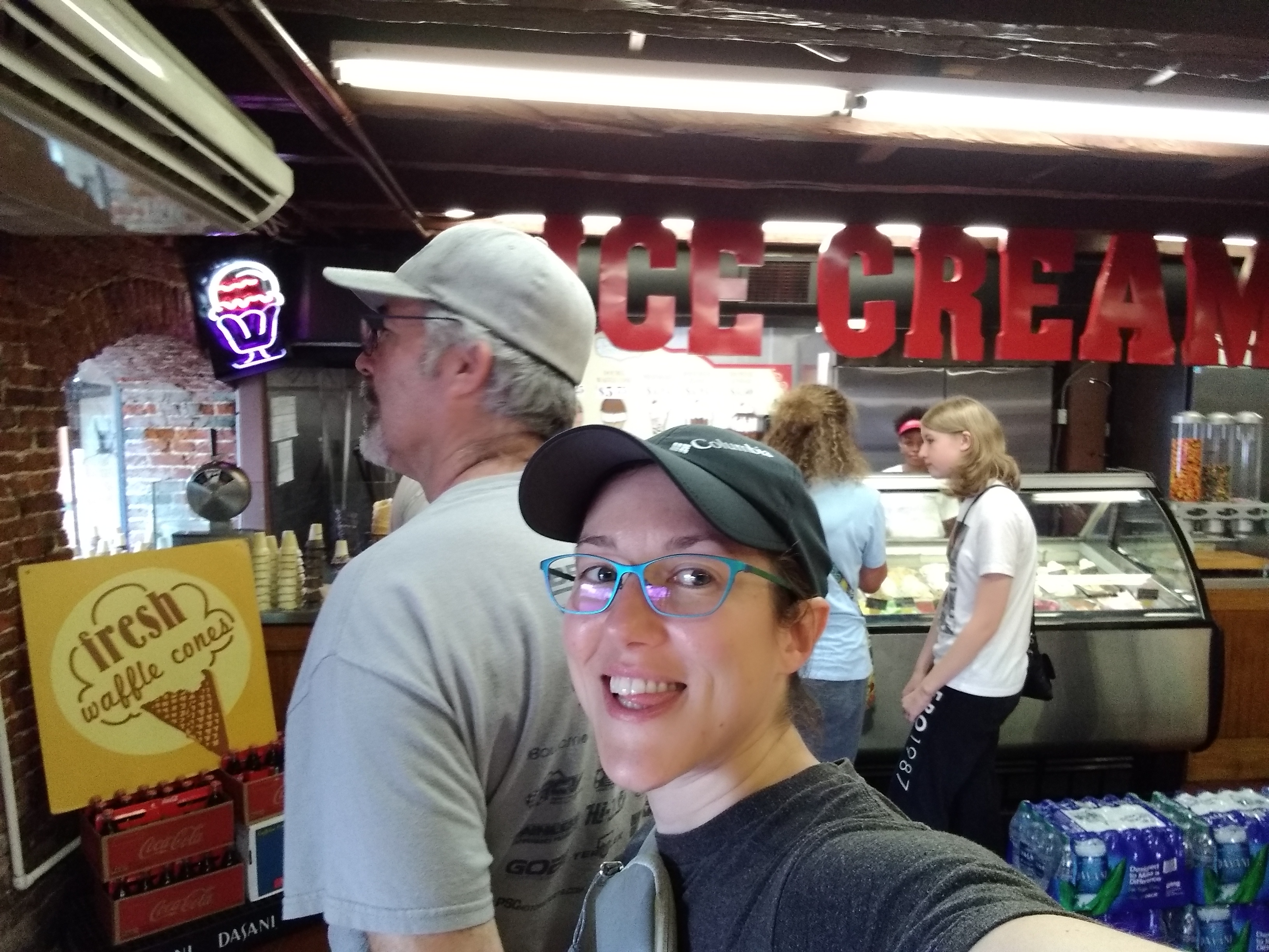 The place had such an energetic vibe. We had a great view of all that was going on. The restaurant menu let you order drinks to go. Downtown Savannah lets you drink alcohol on the streets as long as it’s in a plastic cup. As the evening progressed, we watched as very sunburned drunk people passed by below. It reminded me of pirates of the Caribbean so much. After dinner, we explored a little more and found an old timey ice cream / candy making store. We had classic vanilla ice cream in a freshly pressed waffle cones and explored the candy shop. They had a Taffy making machine that was a hundred years old. It stretched the Taffy, rolled it in paper, dropped it onto a conveyor belt that took it all the way around the room, and dropped it into a bucket for sale. It amazed me that a machine like that could have been built a hundred years ago. It amazes me even more that it was still working and in use today.We went outside and found a bench to sit and enjoyed our ice cream, while doing a little more people watching.