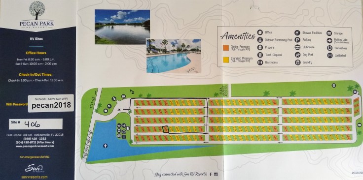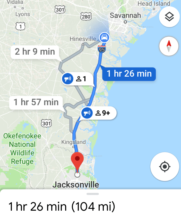 I worry about what we are going to do when it gets hotter. 😳🔥🔥Savannah, GA to Jacksonville, FL is only 104 miles and Google said it would take about an hour and a half. For every hour that Google estimates, we add about another 15 minutes to that. So after that restless night, we took our time this morning eating breakfast and packing up camp.