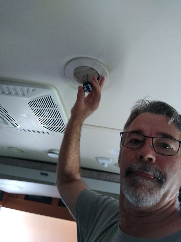 It was already 90° when we got here so we hunkered down in the RV and tried to cool it down by putting reflective window shades up and running the AC. Fred tested the AC coldness with our meat thermometer. We learned that the air coming out of the vent is 57 degrees. The RV is just so big it takes a long time to cool down.