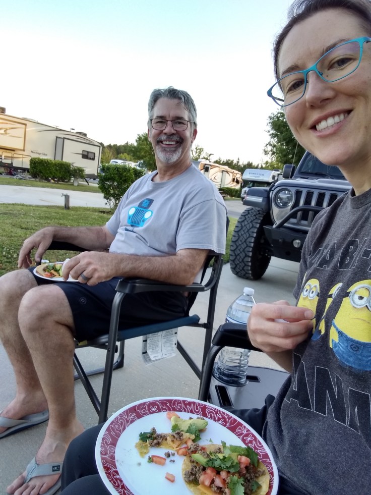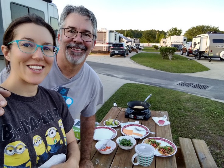 By the time we were done preparing the tacos, it was quite pleasant outside. So we decided to have a little picnic outdoors. The sun was setting behind the RV so we were in the shade and it was quite lovely. The live band playing at the swap meet was actually pretty good. They played some Bachman-Turner Overdrive tunes that Fred really loved. We had some awesome conversation about life and living it to the fullest, and our happiness with taking the opportunity to take this trip. One of Fred’s goals after he retired was to take a long cross-country adventure. So he feels like he has definitely achieved that goal.