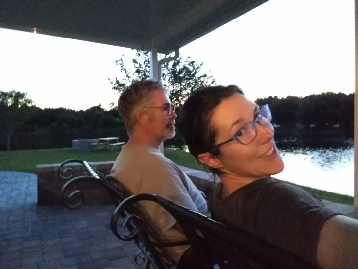 After dinner, Fred chatted with his mom on the phone for a bit. And then we walked around and explored the park and all its amenities. It has a really nice set of bathrooms, and horseshoe pits, and a calming little lake were you can sit in rocking chairs and watch the sunset.
