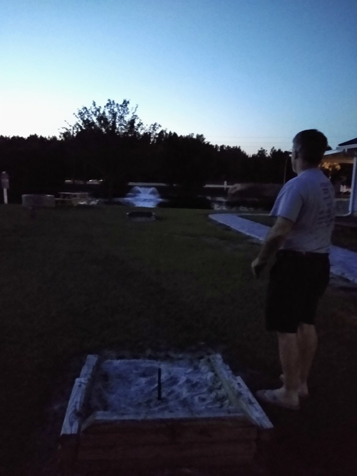 We sat in the rocking chairs and watched the sunset and talked about how cool it would be to see an alligator swim by. And then we played a game of horseshoes until it was too dark to see the posts. Fred reminisced about his dad’s unique way of throwing the horseshoe by one tip instead of by the middle. We both tried it that way but it’s very hard to control.