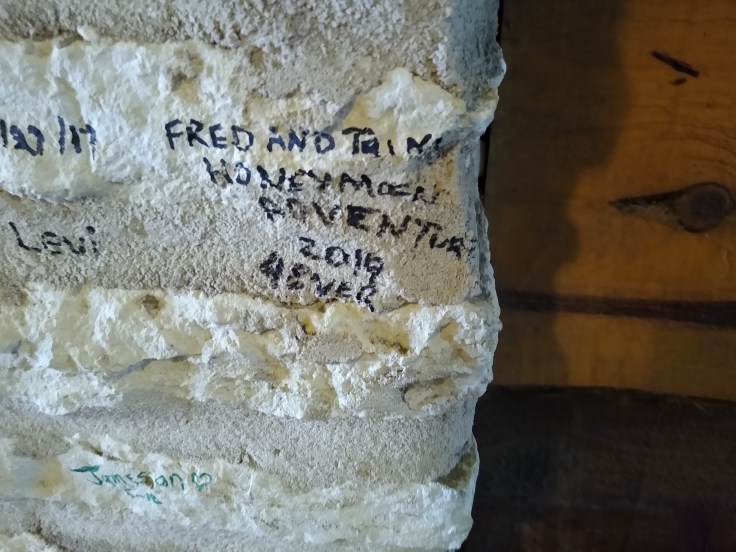 The entryway walls are tastefully graffitied with visitor names and messages. I took the liberty of leaving our mark. (You should always travel with a sharpie just in case. A lot of touristy places let you do this.) I wrote, “Fred and Trina Honeymoon Adventure 2019 4Ever.”