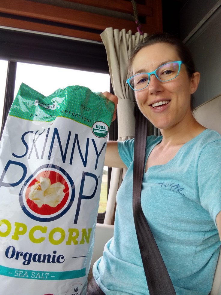 But after we passed up the places to eat in Leander, there was nothing for hours. At least nothing where the motorhome would fit in the parking lot. We snacked a bit on the biggest bag of popcorn I have ever seen…