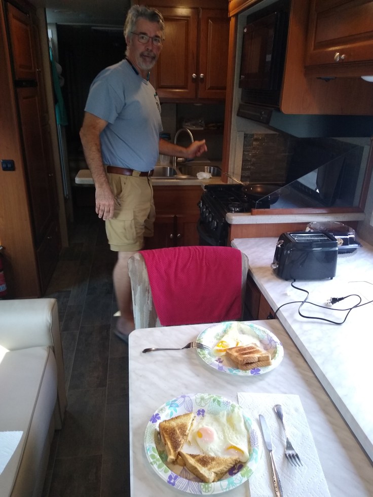 We were trying to put in some good distance today, so we were still driving around 5pm when we hit a lightning storm in Ozona, TX. We still couldn’t find any decent place to eat so we pulled into a rest stop around 5:30pm and made eggs and toast in the RV. It rained pretty hard on us while we sat there and eat dinner.