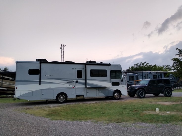 The park wasn’t that bad once we pulled into it. There were actually quite a few nice RVs parked there and it had its own little restaurant. The restaurant was closed for the evening but that was okay because we had already eaten. We tag-teamed the RV set up and made quick work of it. The weather was pretty pleasant too.