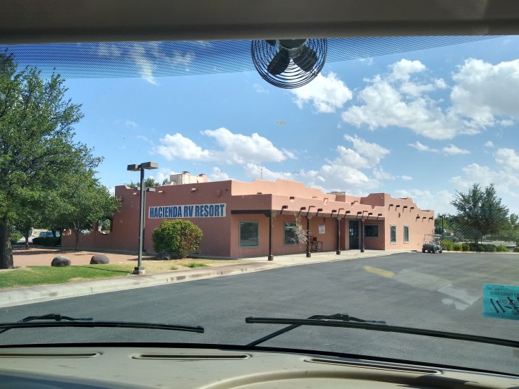 Fred pre-selected the Hacienda RV Resort in Las Cruces, New Mexico, while we ate breakfast this morning. So I called them to see if they had a spot for us tonight. Making phone calls in a moving RV is still incredibly frustrating for me. The bouncing and the rattling and the wind noise is REALLY frazzles my nerves. I got it done though and we had a destination.