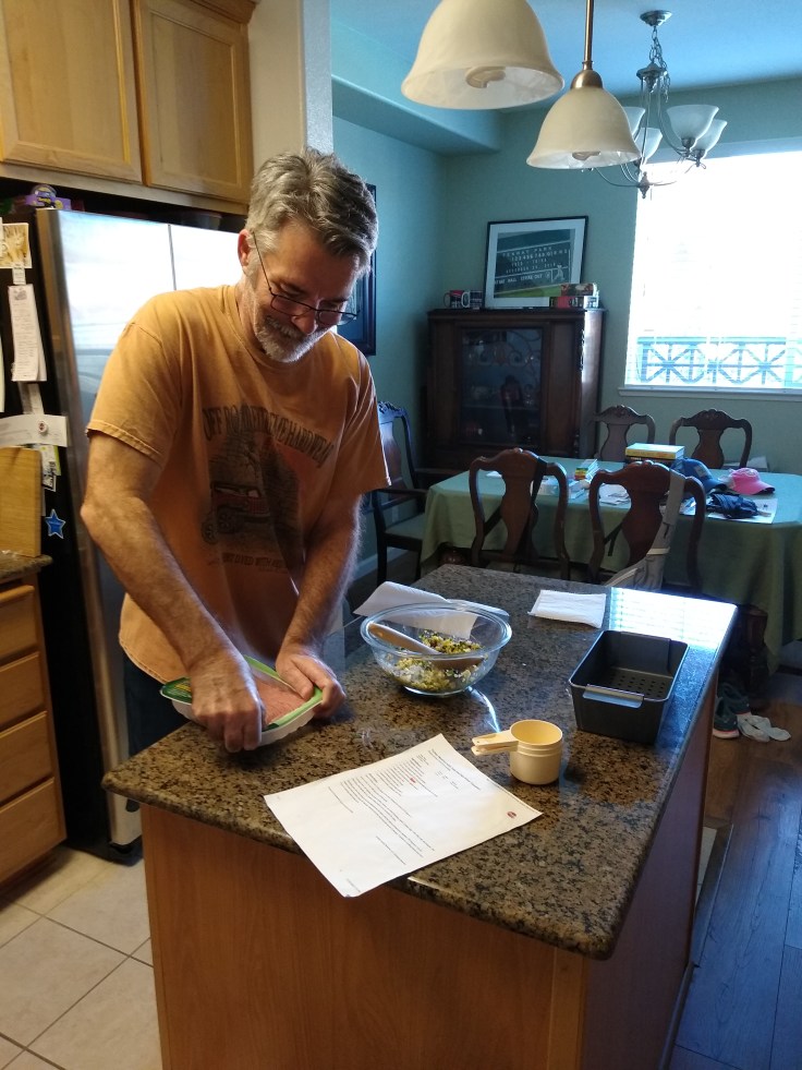 I gave up on the meatloaf that night. I didn’t want to press my luck. I started early the next evening and eagerly prepped the ingredients (after I went to the store to buy more tomatoes). I got it all prepped and then Fred came in and helped me put it all together. (I’m not a big fan of touching raw meat. It activates my germ phobias and makes me very anxious). Fred volunteered to mix it up for me 😁👍