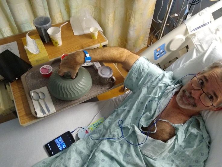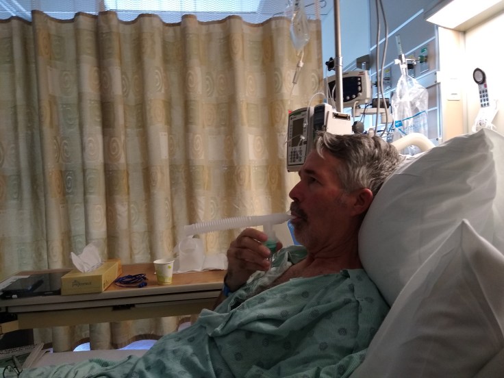 On day two, Fred was still on the no food or drink protocol. It was a long, slow day. Fred was starting to feel better though as his pain was beginning to lesson. They also began treating his cough with albuterol treatments through a nebulizer. That really helped Fred breath much better. His O2 levels were almost back to normal.