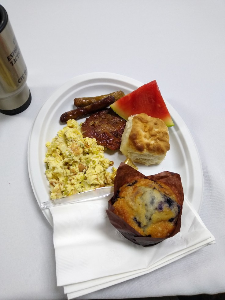 This morning’s breakfast was scrambled eggs with green chillies and onions, breakfast meats, biscuits, and fresh baked muffins. We chowed down, grabbed our bagged lunches (ham sandwiches, oranges, and every peanut snack known to man) and headed to line up at the arena.
