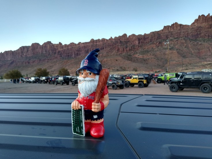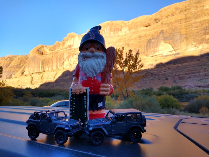We remembered our traveling Red Sox Gnome today and posed him on the roof of the Jeep with the two toy Jeeps that Janet Lockhart had given Fred on top of the birthday cake that she and her husband Pete had made for Fred this year.