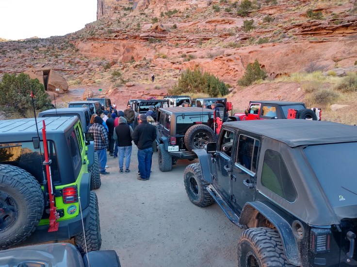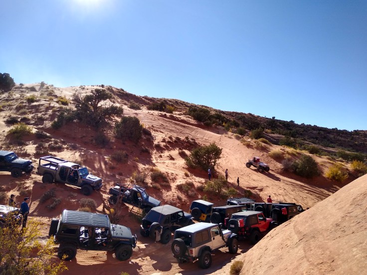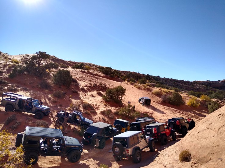 There was a guy in our group named Alex who had a 6 year old boy with him named Jon-Jon. Jon-Jon was running around like he was spun-up on pixie sticks and Mountain Dew. I was afraid for Jon-Jon because he didn’t seem to have any common sense when it came to staying out of the way of the moving vehicles, or staying away from the edge of the ledges. Plus, there was a lot of loose surface rock that could easily send you skating across the ground…towards a hungry cliff. Jon-Jon survived the day unscathed, somehow, but Alex broke his driveline on the last obstacle of the day and had to be towed back down the trail.