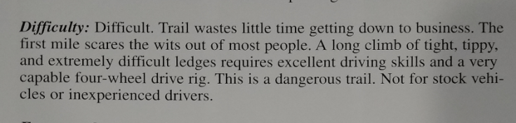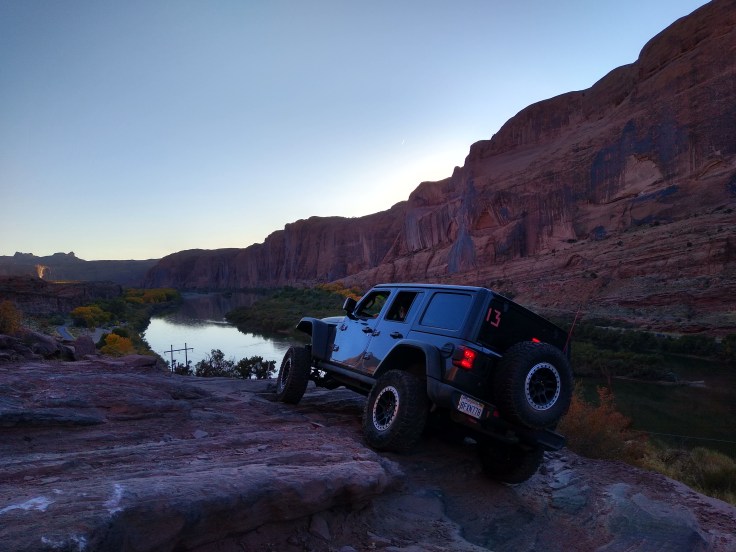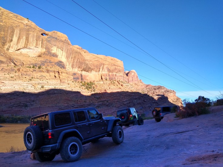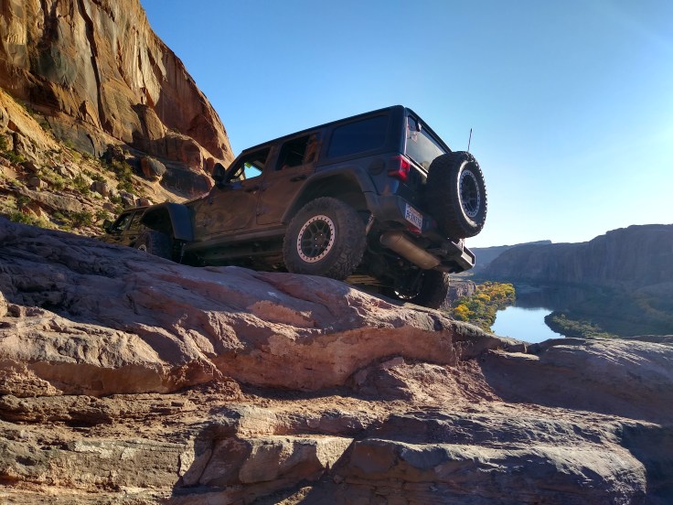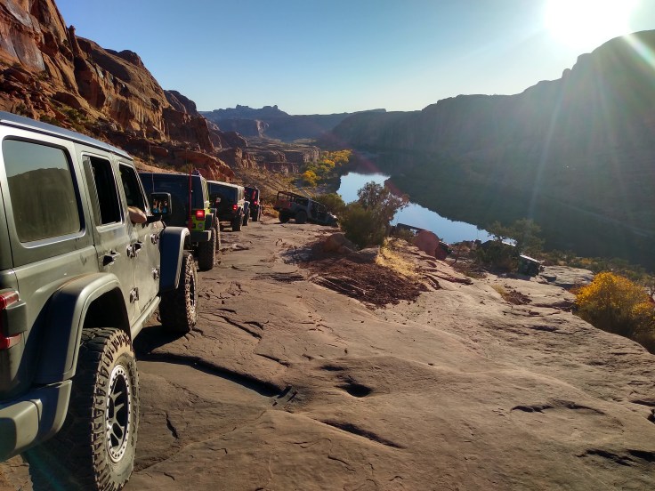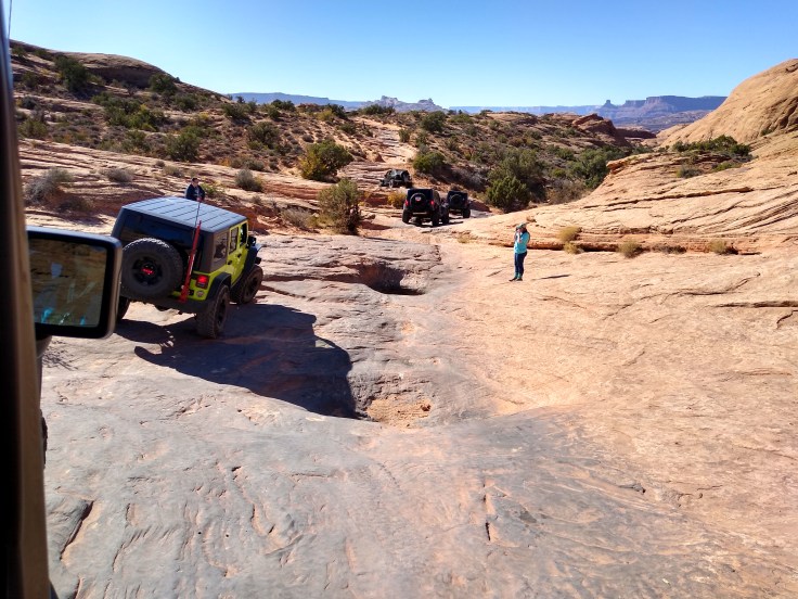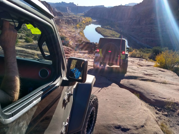To my delight, the trail was not the scary beast described in the trail book. It was gorgeous! And just challenging enough to demand respect but not be overwhelming. The first hour of the climb was on an ascending ledge, but I never felt like I was too close to the edge to feel panic. I wouldn’t advise doing the trail with only one Jeep, but with a spotter and another Jeep for insurance, an experienced Jeeper would be fine.