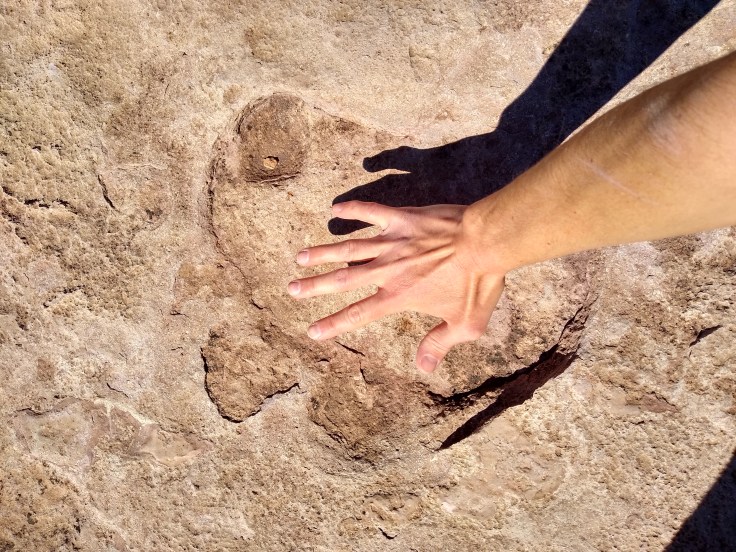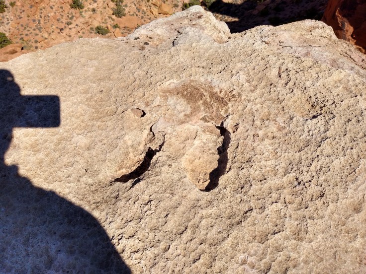 The rooftop is where the dinosaur tracks were located. There were two impressions from a three toed dino right on the structure’s edge. This three toed footprint is very common out here.
