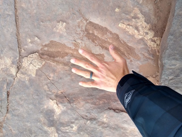 This hill got its name because people routinely flip their Jeeps and scatter their lunches. Sadly, the hill was closed to the public. So we went to the main entrance of Hell’s Revenge and did the first mile of the trail. You can see dinosaur tracks on this point in the trail. We enjoyed the view and explored the tracks. Side note: Jeeping on a very full belly is not such a good idea… 🥴
