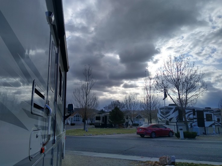 We had fair weather but very gusty winds as we drove west towards Reno, Nevada. A 30 foot long RV towing a Jeep is like a giant wind sock, so Fred had his work cut out for him today.